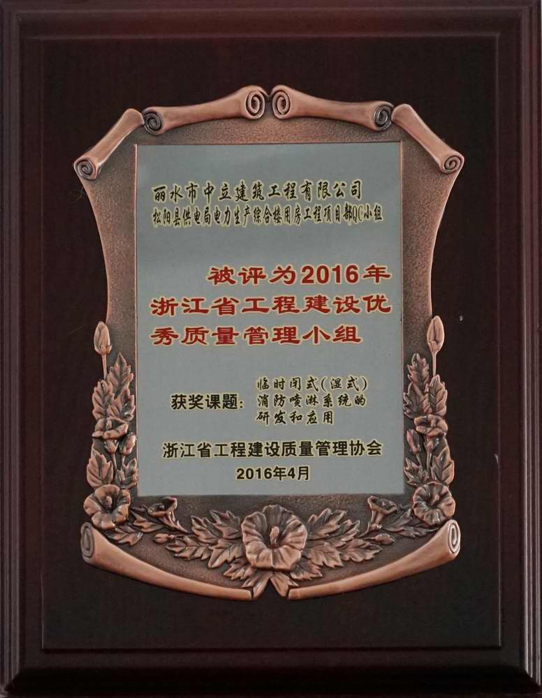 浙江省工程建設(shè)質(zhì)量管理協(xié)會于2016年4月27日至29日在杭州之江飯店舉行2016年度浙江省工程建設(shè)優(yōu)秀QC成果發(fā)布會。我公司松陽縣供電局電力生產(chǎn)綜合樓用房工程項目部QC小組的活動成果“臨時閉式(濕式)消防噴淋系統(tǒng)的研發(fā)和應(yīng)用”參與交流,小組被評為2016年浙江省工程建設(shè)優(yōu)秀質(zhì)量管理小組。該成果有效地解決了高層建筑施工階段火災(zāi)控制的安全保障問題,具有施工方便、安全可靠等優(yōu)點(diǎn),且該系統(tǒng)可周轉(zhuǎn)多次重復(fù)利用,節(jié)約了工程造價成本,值得推廣到其它高層建筑施工項目部。