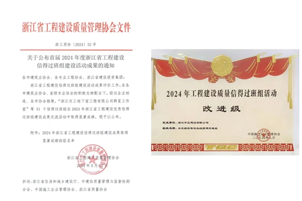 在2024年度工程建設(shè)質(zhì)量信得過班組比賽中,我公司水東樞紐項目團隊獲得浙江省建設(shè)成果取得顯著成績班組和中國施工企業(yè)管理協(xié)會《2024年度工程建設(shè)質(zhì)量信得過班組改進(jìn)級》。