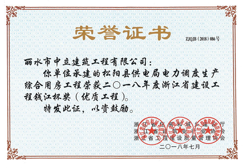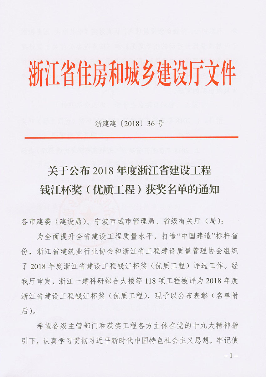 喜報(bào)!近日,省建設(shè)廳頒發(fā)了2018年度浙江省建設(shè)工程“錢江杯”(優(yōu)質(zhì)工程)文件,我公司“麗水市體育館體育中心工程、松陽(yáng)縣供電局電力調(diào)度生產(chǎn)綜合用房工程”分別獲得2018年度“錢江杯”(優(yōu)質(zhì)工程)獎(jiǎng)。
