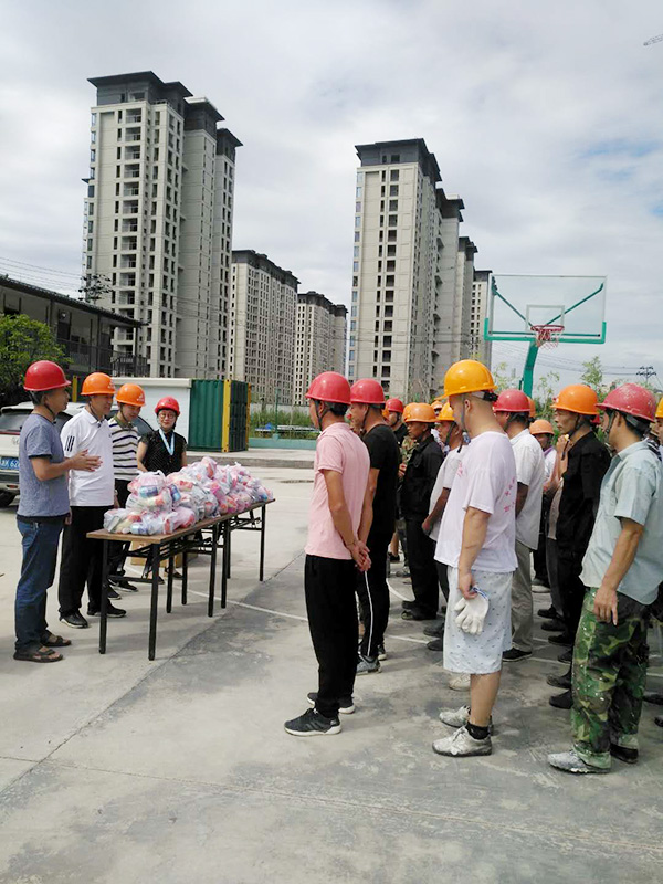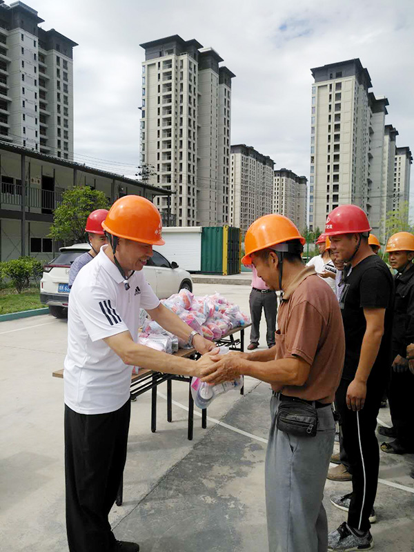 8月31日上午,烈日當空,驕陽似火。市住房城鄉(xiāng)建設(shè)局副局長蔣金松、法規(guī)處處長呂躍華、施工管理處呂飛熊處長以及建筑業(yè)協(xié)會麻秘書長等單位領(lǐng)導(dǎo),冒著酷暑來到我公司市人民醫(yī)院東城院區(qū)項目,向工人們送去防暑降溫藥品、飲品,慰問工作在第一線的管理人員和民工,開展夏季“送清涼、送法律、送安全”活動。讓廣大一線工人們在炎炎夏日感受到深深涼意。