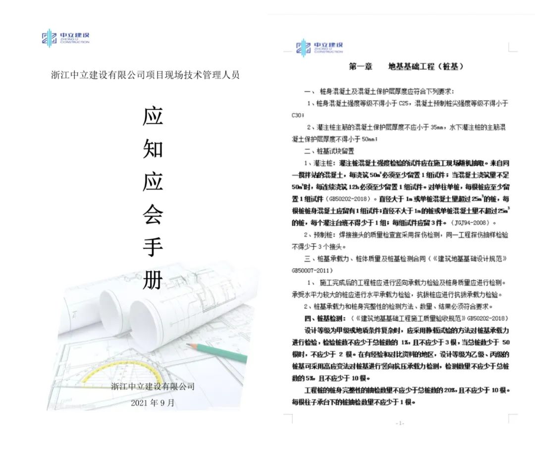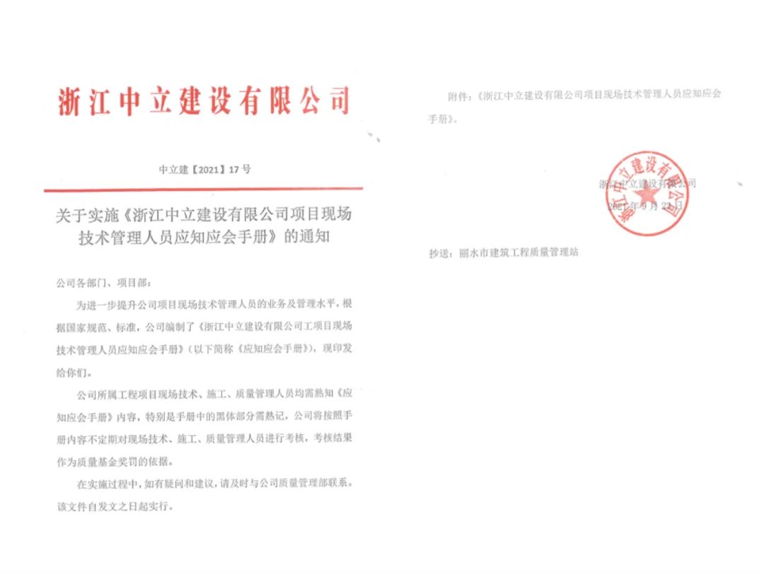 為進一步提升公司項目現(xiàn)場技術管理人員的整體業(yè)務和管理水平,積極開展“質(zhì)量月”活動,根據(jù)國家標準規(guī)范,中立建設編制了《浙江中立建設有限公司工項目現(xiàn)場技術管理人員應知應會手冊》,并于9月23日發(fā)文實施。這是繼今年6月份我公司出臺的《工程質(zhì)量通病防治(2021試行)》后的又一重要技術性手冊。